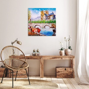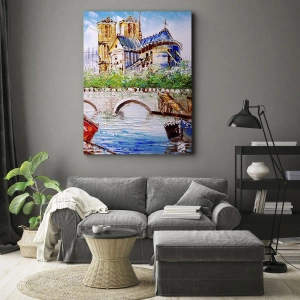 Dit landschap valt op door de pittoreske weergave van een stedelijk landschap, waarbij de brug en de kathedraal het middelpunt van de compositie vormen. Zeilboten op de rivier voegen dynamiek en nostalgisch karakter toe aan het tafereel. De levendige en harmonieuze kleuren van het schilderij brengen warmte en een aangename sfeer in het interieur.