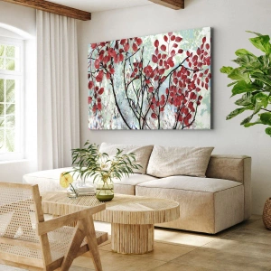Dankzij de afmetingen en het horizontale formaat is het schilderij gemakkelijk aan te passen aan verschillende ruimtes. De hoogwaardige afwerking en duurzame materialen garanderen intense kleuren die jarenlang hun frisheid behouden. Rode bladeren tegen een heldere hemel symboliseren harmonie en lichtheid, waardoor dit schilderij een ideale keuze is voor wie waarde hecht aan rust en de schoonheid van de natuur.