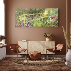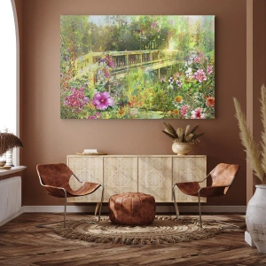 - Dit schilderij toont een pittoreske brug, omringd door weelderige vegetatie en kleurrijke bloemen, wat een harmonieuze en romantische sfeer creëert. Een perfecte decoratie voor liefhebbers van de natuur en prachtige landschappen. Afmetingen: 70x50 cm, ...