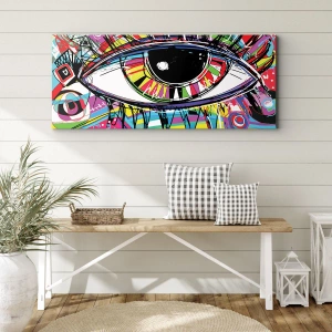 Ideaal voor diverse ruimtes, zoals de woonkamer, kantoor, slaapkamer of zelfs een creatieve ruimte. Het oogmotief kan op vele manieren worden geïnterpreteerd, waardoor dit schilderij een interessant gespreksonderwerp en een bron van reflectie is. De intense kleuren en artistieke pop-art-stijl passen perfect bij moderne interieurs.