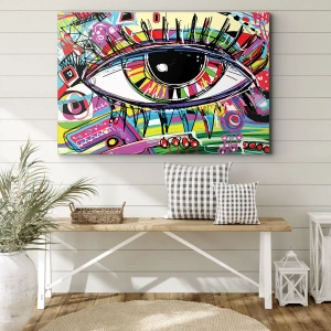- Deze canvasprint toont een abstract, kleurrijk oog in graffitistijl. Levendige kleuren zoals roze, blauw en geel zorgen voor een dynamisch effect, perfect voor moderne en popartinterieurs.
