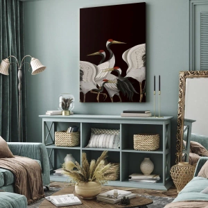 - Dit schilderij toont witte kraanvogels met rode accenten op een zwarte achtergrond. Perfect voor moderne interieurs geïnspireerd door de natuur en elegantie. De canvasprint is 70x50 cm.