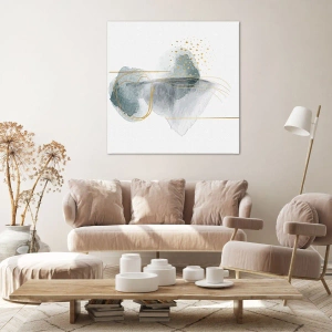 De kleuren van het schilderij, met dominante turquoise en goudtinten, geven het interieur een gevoel van lichtheid en elegantie. Organische vormen en een minimalistische expressie creëren een sfeer van harmonie en evenwicht in de kamer. Dankzij de subtiliteit en veelzijdigheid past dit schilderij bij zowel moderne als klassieke interieurs.