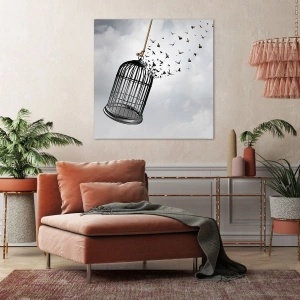 - Het schilderij toont een open kooi waaruit vogels vliegen tegen een heldere hemel. De symboliek van vrijheid en hoop maakt het een unieke aanvulling op interieurs die emotie en de lichtheid van het leven willen uitdrukken.