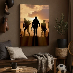 - Dit schilderij toont soldaten tegen een achtergrond van een ondergaande zon in een dynamische setting. Perfect voor interieurs die geïnspireerd zijn door kracht en vastberadenheid. Het schilderij is 70x50 cm groot.