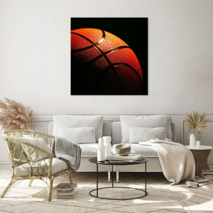 - Een opvallende afbeelding van een oranje basketbal tegen een donkere achtergrond. Perfect voor moderne interieurs en ruimtes met een sportthema, het voegt dynamiek en stijl toe.