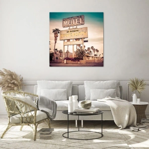 Schilderen op glas - Een oud motelbord omgeven door palmbomen creëert een retrosfeer - 70x50cm - Hier staat de tijd stil - Moderne wanddecoratie voor woonkamer en slaapkamer ARTTOR