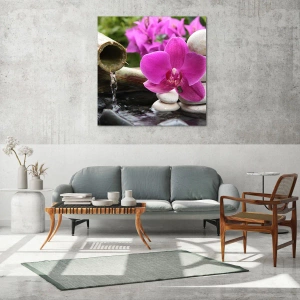 Dankzij de print "Paarse orchidee, stenen en bamboewaterval" wordt uw interieur harmonieus en creëert u een plek die bevorderlijk is voor ontspanning en meditatie. Het is een uitstekende keuze voor wie de schoonheid van de natuur wil combineren met functionele esthetiek.