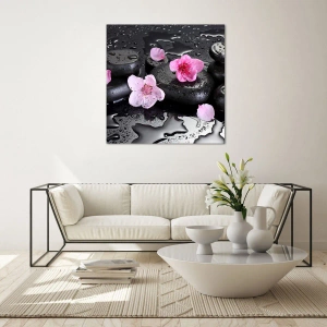 - De glasschildering toont zwarte spa-stenen omringd door roze bloemen tegen een natte achtergrond. De minimalistische compositie straalt rust, elegantie en harmonie uit en vormt het perfecte decoratieve accent voor elk interieur.