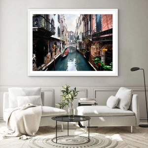 Poster in een witte lijst - Venetiaans landschap met een gondel en een brug - 91x61 cm