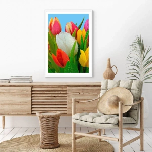 Poster in een witte lijst - Een bloemenregenboog in dauwdruppels - 70x50 cm