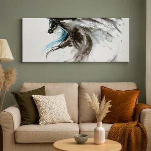 - Het schilderij toont een dynamische samensmelting van een vrouw en een paard in een artistieke aquarelvorm. De compositie straalt beweging en elegantie uit, perfect voor moderne interieurs.
