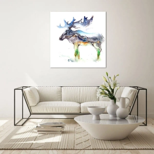 Schilderen op glas - Aquarelschilderij van een eland met een bergsilhouetmotief - 70x50cm - De held van een winters verhaal - Moderne wanddecoratie voor woonkamer en slaapkamer ARTTOR