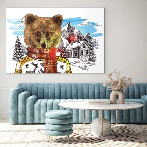 • Een beer met een sierlijke trui en sjaal, afgebeeld tegen een schilderachtig winterlandschap met een berghut. Deze illustratie is uitgevoerd in een artistieke stijl, perfect voor interieurdecoratie.