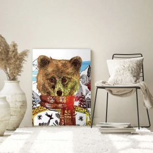 De illustratie wordt gekenmerkt door een schetsmatige stijl die de subtiele details van zowel de beer als de omgeving benadrukt. Dankzij de rijke kleuren en unieke compositie past het schilderij perfect in interieurs die zijn ingericht in een Scandinavische, moderne of rustieke stijl. Het past ook perfect in de winter- en vakantiesfeer.