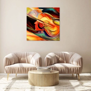 • Abstractie, vrouwengezicht, viool, Abstracties, cultuur, mensen, muziek, Voor op kantoor, voor de studeerkamer, voor de eetkamer, voor de hal, voor de woonkamer, voor de slaapkamer, Rood, oranje, kleurrijk, Panoramisch