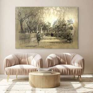 Schilderen op glas - Een tekening van een park met paden en wandelende mensen - 70x50cm - Een moment gestopt met een veer - Moderne wanddecoratie voor woonkamer en slaapkamer ARTTOR