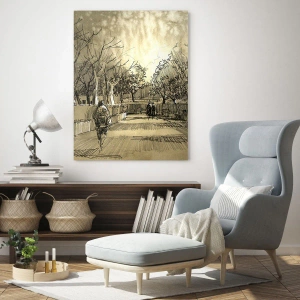 Het schilderij 'Een moment vastgelegd met een pen' is een unieke compositie van een park, vastgelegd in de vorm van een tekening. De scène met paden en wandelende figuren straalt rust en nostalgie uit en creëert een harmonieuze en gezellige sfeer.