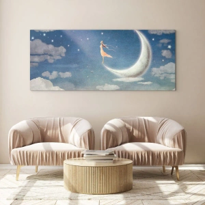 - Dit sfeervolle schilderij toont een vrouw op de maan aan een sterrenhemel. Een ideaal decoratief element voor interieurs met een sprookjesachtige of artistieke sfeer.