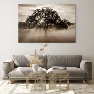 Het sepia landschap geeft het landschap een nostalgisch karakter, dat doet denken aan momenten die buiten bij zonsopgang worden doorgebracht. De boom, alleenstaand tegen de achtergrond van een uitgestrekt landschap, symboliseert de kracht en duurzaamheid van de natuur.