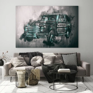 • Dit retroschilderij van een oude auto heeft een grijze achtergrond en turquoise accenten. Het is de perfecte aanvulling op industriële of vintage interieurs en geeft ze een unieke sfeer.