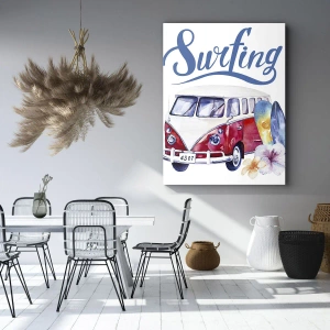 De kleuren van de afbeelding, rijk aan rood, blauw en wit, trekken de aandacht en geven het interieur energie. De inscriptie "Surfen" bovenaan de afbeelding benadrukt de thematische lichtheid en zomerse sfeer en nodigt uit tot ontspannen aan het water. Dit schilderij is een perfecte aanvulling op zowel moderne als klassieke interieurs, vooral voor liefhebbers van boho- en retrostijlen.