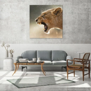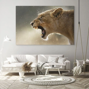 - Dit artistieke schilderij toont een brullende leeuw, gevangen in de zonnestralen. Het benadrukt perfect de schoonheid van de natuur en haar woestheid, perfect voor moderne interieurs.
