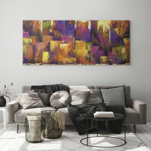 - Het glasschilderij van 70x50 cm toont een abstract beeld van de metropool in warme kleuren, verrijkt met paarse accenten die een unieke sfeer creëren.