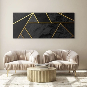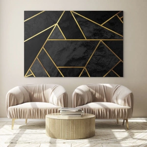 Precieze geometrische lijnen in goud contrasteren met het diepzwarte van de achtergrond en creëren een effectieve en elegante compositie. De achtergrond met marmerstructuur voegt een subtiele structuur toe aan het geheel en geeft de kamer harmonie en een uniek karakter.