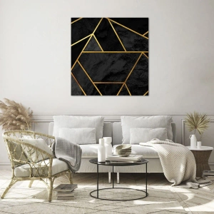 Voeg luxe en klasse toe aan uw interieur met de Darkness and Glow glasprint. De geometrische compositie in goudtinten geeft elke kamer een sprankelende uitstraling en creëert een onvergetelijke sfeer.