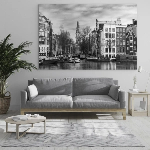 "Amsterdamse Sfeer" is een uniek schilderij op glas dat de kijker meeneemt naar het hart van Amsterdam. Het karakteristieke uitzicht op de gracht, omringd door historische huurkazernes en boten, legt de sfeer van deze bijzondere stad vast. Het zwart-witte kleurenschema voegt een klassieke elegantie toe aan de foto en benadrukt architectonische details en weerspiegelingen in het water.