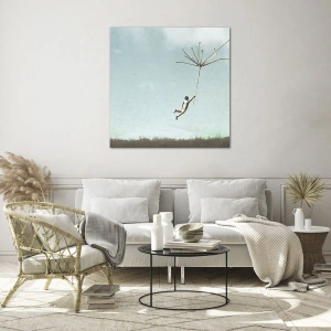 - Een artistieke scène van een jongen die zweeft met een paardenbloemzaadje. Een schilderij vol lichtheid en kinderlijke verbeelding, in delicate kleuren, perfect voor interieurs met een vleugje fantasie en dromen.