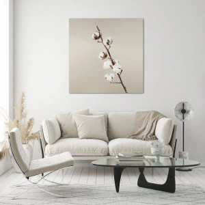 Een close-up van een natuurlijk element zoals katoen laat de kijker zich verdiepen in een wereld van details die ons in de dagelijkse hectiek meestal ontgaan. Het schilderij legt de zachtheid en lichtheid van de plant perfect vast en presenteert deze tegelijkertijd op een grafische, bijna symbolische manier. Een enkele tak wordt een metafoor voor tederheid, eenvoud en de oeroude schoonheid van de natuur. Dankzij de evenwichtige compositie kan dit werk zowel een blikvanger als een subtiel accent zijn...