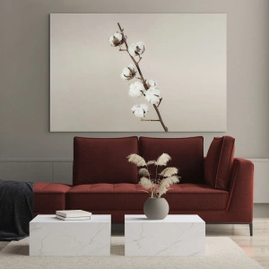 • Het schilderij toont een enkele katoentak tegen een lichtbeige achtergrond. De eenvoudige compositie en ingetogen kleuren creëren een kalme, natuurlijke sfeer, perfect voor moderne en minimalistische interieurs.