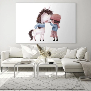 De illustratie decoreert niet alleen, maar brengt ook een boodschap over. Een kinderkamer die met zo'n print is versierd, wordt een ruimte vol liefde, begrip en magie. Een sprookjesmeisje, een buitengewone eenhoorn en een emotionele vriendschap creëren een compositie die elke dag ontroert en inspireert. Het is een prachtig visueel verhaal voor elke kleine dromer.