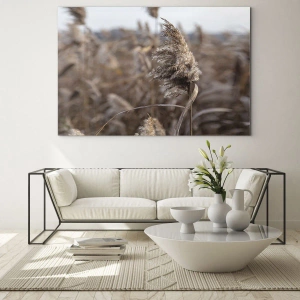- Het schilderij toont een close-up van droog gras dat wuift in de wind, wat een kalme en ingetogen sfeer creëert. Natuurlijke kleuren en zachte lijnen geven de compositie een subtiele en harmonieuze uitstraling, perfect voor interieurs met een natuurlij...
