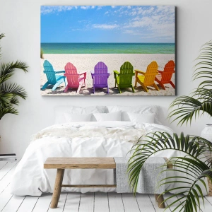 Het strandmotief met kleurrijke ligstoelen symboliseert ontspanning, harmonie met de natuur en levensvreugde. Dit maakt deze print een ideale keuze voor liefhebbers van zomerse landschappen en subtiele interieurdecoraties. Het is ook een geweldig cadeau-idee voor wie waarde hecht aan een vakantiesfeer en positieve emoties.