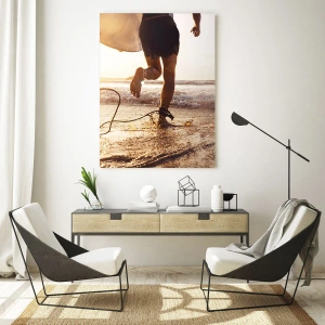 - Dit dynamische schilderij toont een surfer die met zijn board richting de golven rent bij zonsondergang. Het is de perfecte decoratie voor watersporters en iedereen die van een vakantiesfeer houdt.