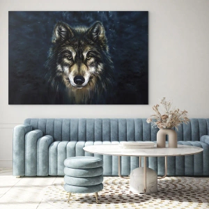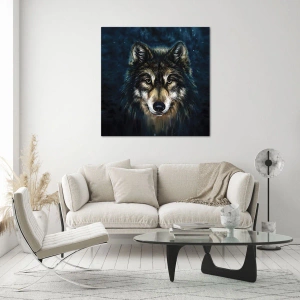 - Het schilderij toont een realistische opname van een wolf die recht voor zich uit staart. De donkere, bosrijke achtergrond versterkt de mysterieuze sfeer, en de nauwkeurig weergegeven details van de vacht en blik trekken de aandacht van de kijker.