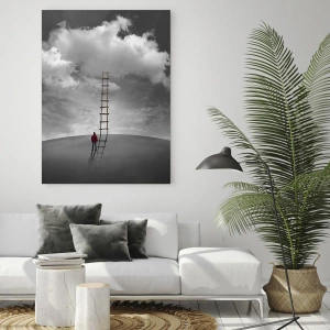 • Een symbolische scène van een persoon die aan de voet van een ladder staat die naar een wolk leidt. De zwart-witte esthetiek met een vleugje rood inspireert tot reflectie en dromen.