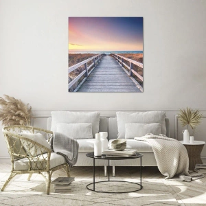 - Een schilderij van een houten steiger die door het gras naar de zee leidt, verlicht door een pastelkleurige zonsondergang. Het sfeervolle landschap brengt een sfeer van zomerse ontspanning en rust in het interieur. Perfect voor lichte, ruime interieurs.