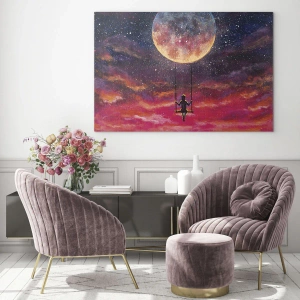 - Het schilderij toont een meisje dat op een schommel onder de maan schommelt, tegen een achtergrond van een sterrenhemel in roze en paarse tinten. Het is vol magie en kinderfantasie.