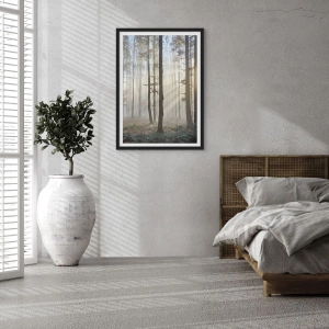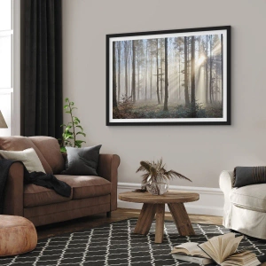- Een betoverend uitzicht op een ochtendbos, met zonlicht dat door de mist heen breekt. Deze poster creëert een sfeer van vrede en harmonie.