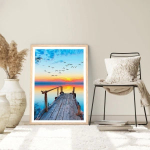 • Landschap, Houten Brug, Meer, Landschappen, Maritiem, Bruggen, Natuur, Voor op kantoor, voor de studeerkamer, voor de eetkamer, voor de badkamer, voor de hal, voor de woonkamer, voor de slaapkamer, Bruin, blauw, oranje, Horizontaal