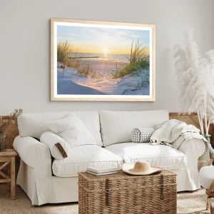 Een poster in een licht eiken lijst - Het geluid van de zee, het zingen van vogels, een wild strand tussen het gras... - 30x40 cm