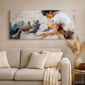 Het canvas wordt over het frame gespannen. De zijkanten en randen zijn bedrukt en zetten het beeld voort. De schilderij is klaar om aan de muur te hangen. Elk product heeft een hanger aan het frame en een montagekit (schroef + pin).