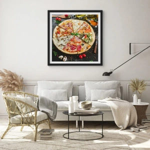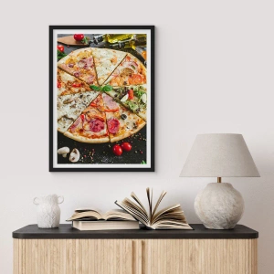 Poster in een zwarte lijst - Kleurrijke pizza verdeeld in verschillende stukken - 50x70cm - Een scala aan smaken - Moderne wanddecoratie voor woonkamer en slaapkamer ARTTOR