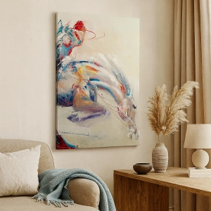 Schilderij op canvas "Dynamisch schilderij van een paard in een abstracte artistieke stijl" is een uniek werk dat intense kleuren combineert met een expressieve vorm. Het silhouet van een paard, afgebeeld in beweging, straalt energie en dynamiek uit en benadrukt de schoonheid en kracht van dit majestueuze dier. De abstracte stijl van de compositie geeft het een modern karakter, waardoor het een uniek decoratief element is.