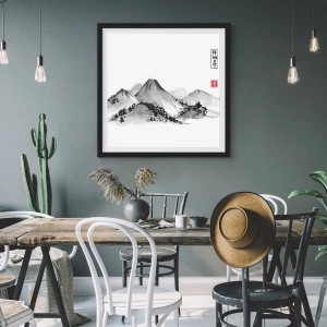 - Deze poster toont een minimalistisch Japans berglandschap. De zwart-witcompositie valt op door zijn subtiliteit en harmonie, perfect voor moderne of klassieke interieurs.
