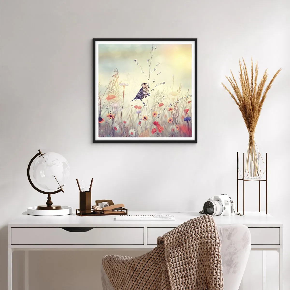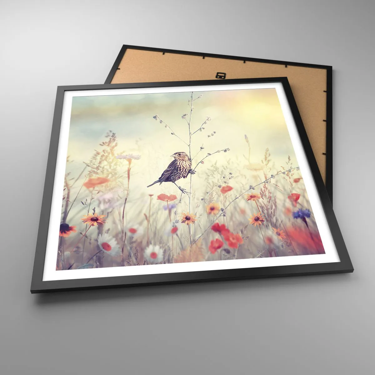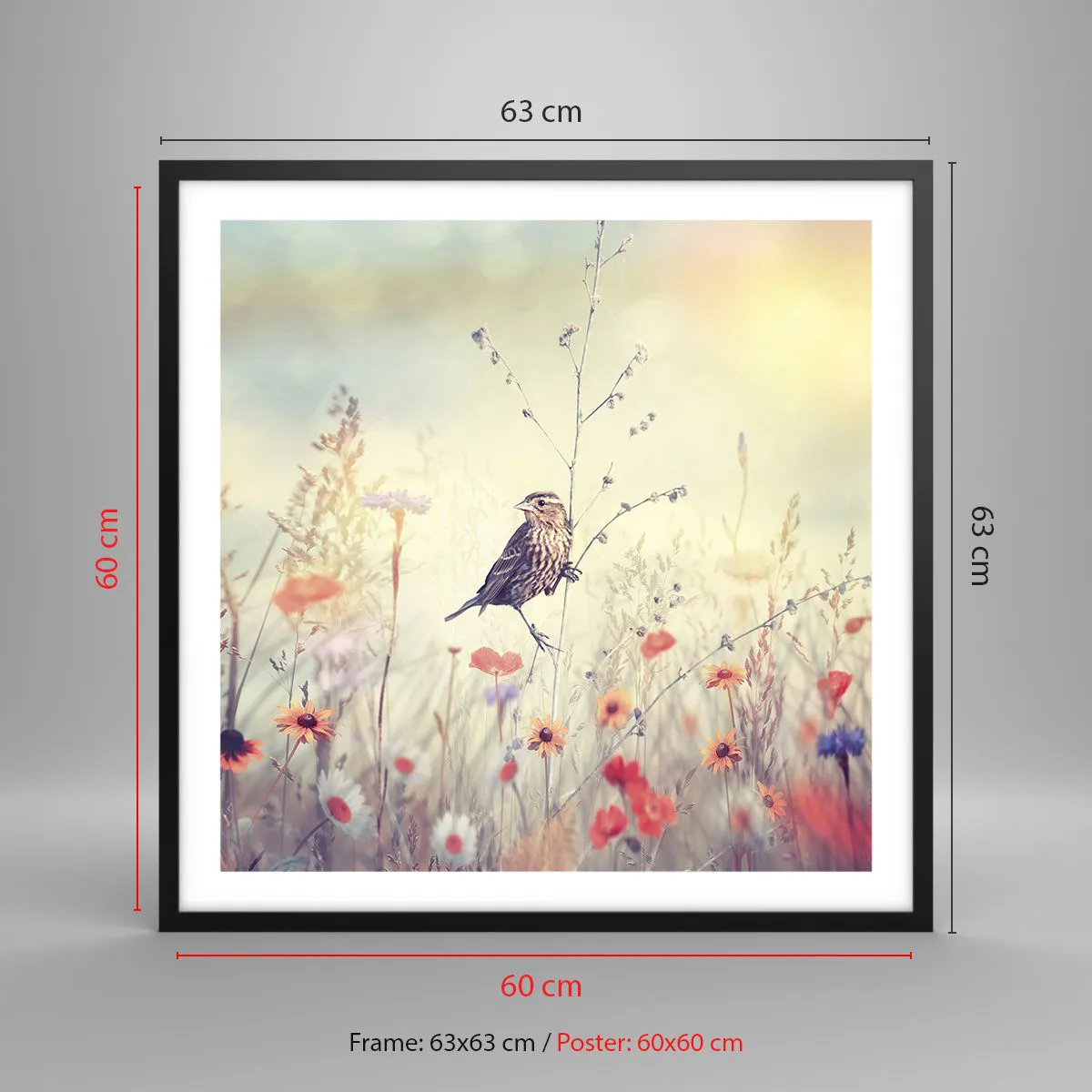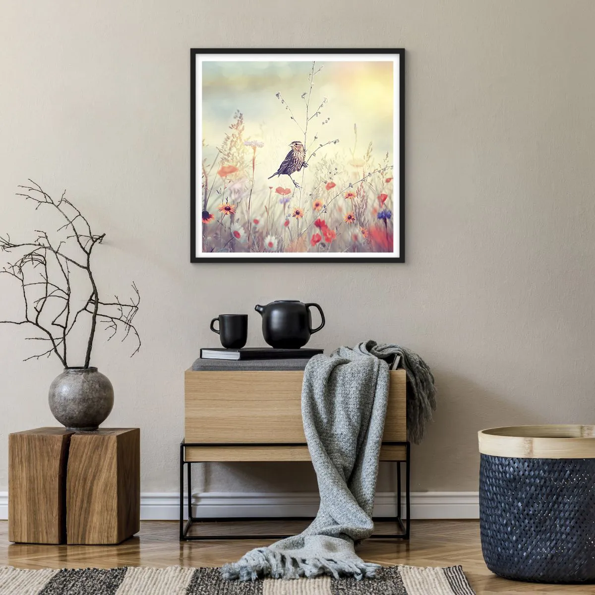 Poster in een zwarte lijst - Vogelportret met een weiland op de achtergrond - 60x60 cm